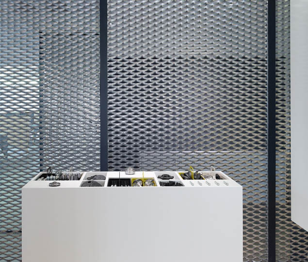 金属铝拉网装饰在有限的空间里体现出无限的视觉感觉理性的线条,感性的色彩。融为刚冷而不失人情味的环境。